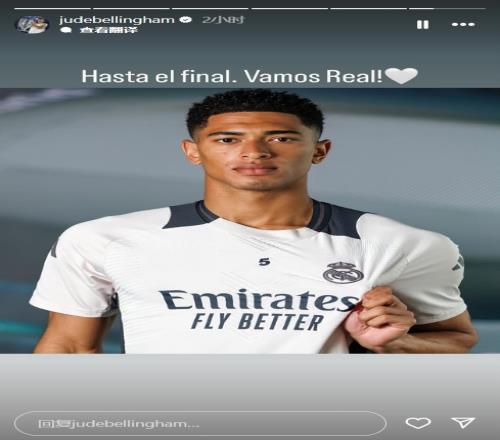 赛前,皇马中场贝林厄姆在社交媒体上鼓励球队继续前进,他上传了自己身穿皇马球衣展示队徽的照片,并配文写道:“坚持到底,加油皇马!”