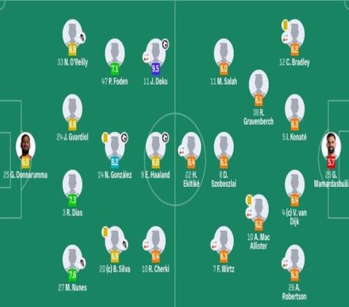 利物浦首发:25-马马尔达什维利、12-布拉德利(83'2-戈麦斯)、4-范戴克、5-科纳特、26-罗伯逊(56'6-凯尔凯兹)、38-赫拉芬贝赫、8-索博斯洛伊、10-麦卡利斯特(74'17-琼斯)、11-萨拉赫(83'14-基耶萨)、7-维尔茨、22-埃基蒂克(56'18-加克波)