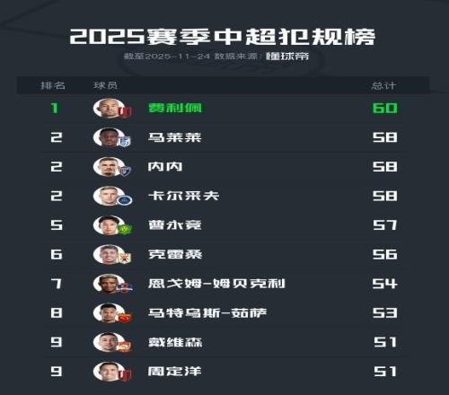 11月22日,2025赛季中超联赛落下战幕。根据懂球帝统计的2025赛季中超球员犯规榜:成都蓉城队费利佩以60次排在首位;大连英博队马莱莱、云南玉昆队内内、深圳新鹏城队卡尔采夫并列第二。
