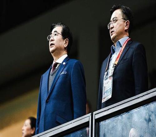赛前,成都蓉城主帅徐正源与球员韦世豪、胡荷韬等人在酒店门口迎接足协掌门人宋凯的到来。