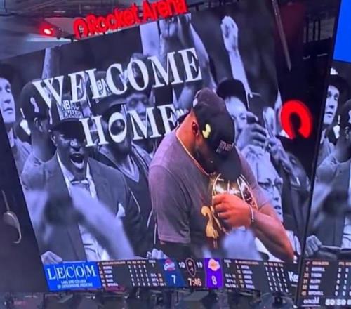 比赛暂停期间,骑士主场播放了致敬詹姆斯的视频,回顾了詹姆斯效力骑士时期的经典时刻。在场边观看的詹姆斯用球衣擦拭眼角。