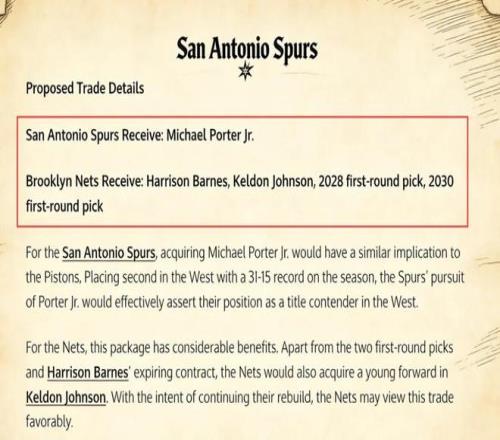 美媒《Fadeaway World》则提出了4换1的交易方案,建议马刺送出巴恩斯、凯尔登、2028年以及2030年的首轮签,从篮网引入前锋小波特。