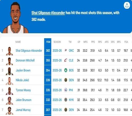 北京时间今日,在NBA常规赛中,俄克拉荷马雷霆队在客场以105-108不敌菲尼克斯太阳队,遭遇本赛季的第六场失利。比赛期间,转播方晒出了一组数据,在本赛季的运动战投篮命中数方面,雷霆